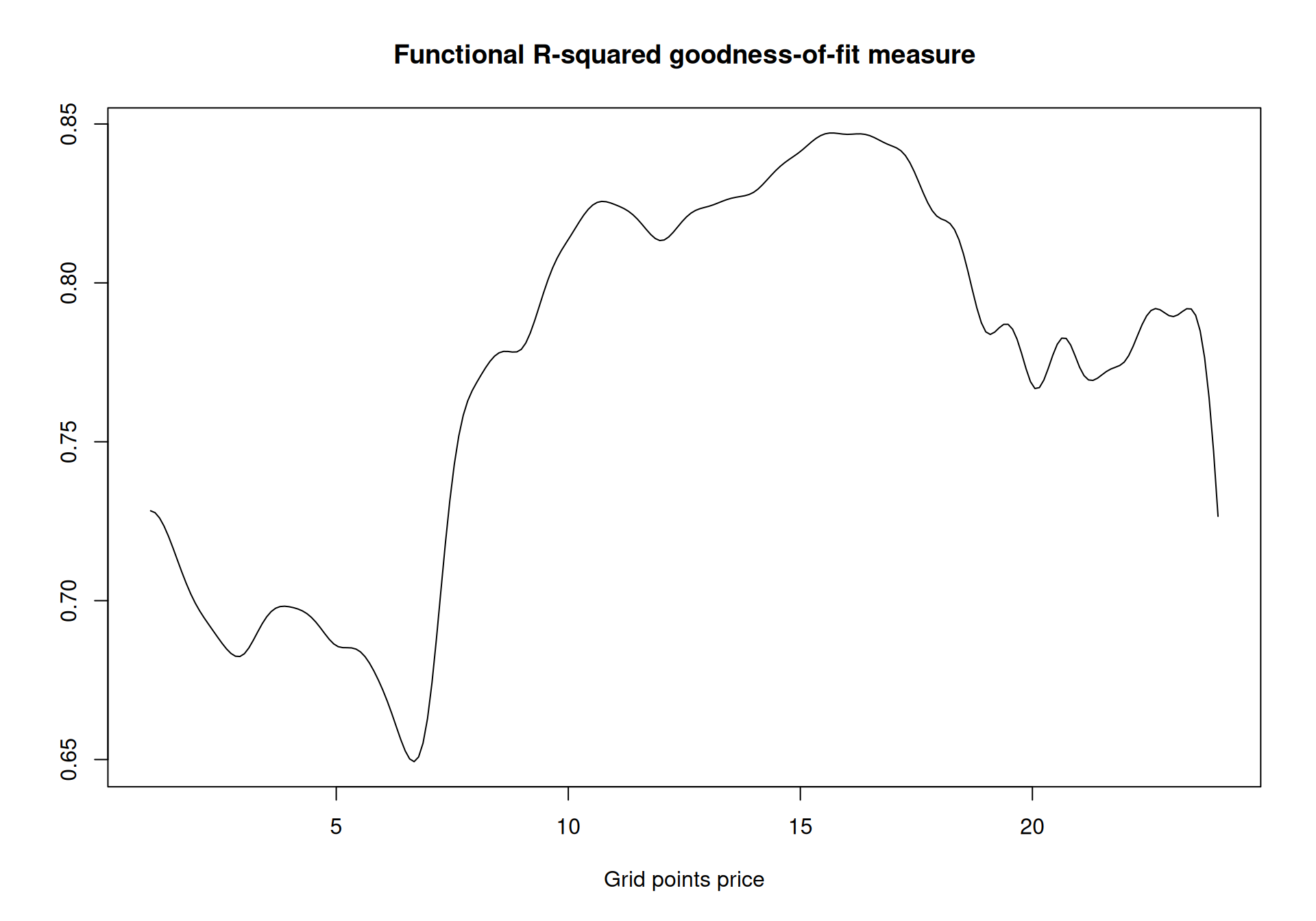In functional linear regression, the model’s explanatory power can vary across the domain of the response. The plot below shows the R-squared value at each point of the electricity price curve, indicating for which hours the model explains the data well and where it may be less effective.